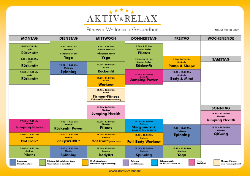 In diesem Kurs werden Elemente aus Rückenfit, Wirbelsäulengymnastik, Pilates, bodyART, Yoga, Beckenbodentraining und vielem mehr zu einem ganzheitlichen Rückenkräftigungsprogramm kombiniert. Der Schwerpunkt liegt dabei auf der Stärkung und Mobilisierung deiner wichtigsten Stützmuskeln. Dieses abwechslungsreiche Programm ist ideal für jeden, der Rückenbeschwerden loswerden oder diesen vorbeugen möchte. Ein Kurs, der für jeden geeignet ist.
